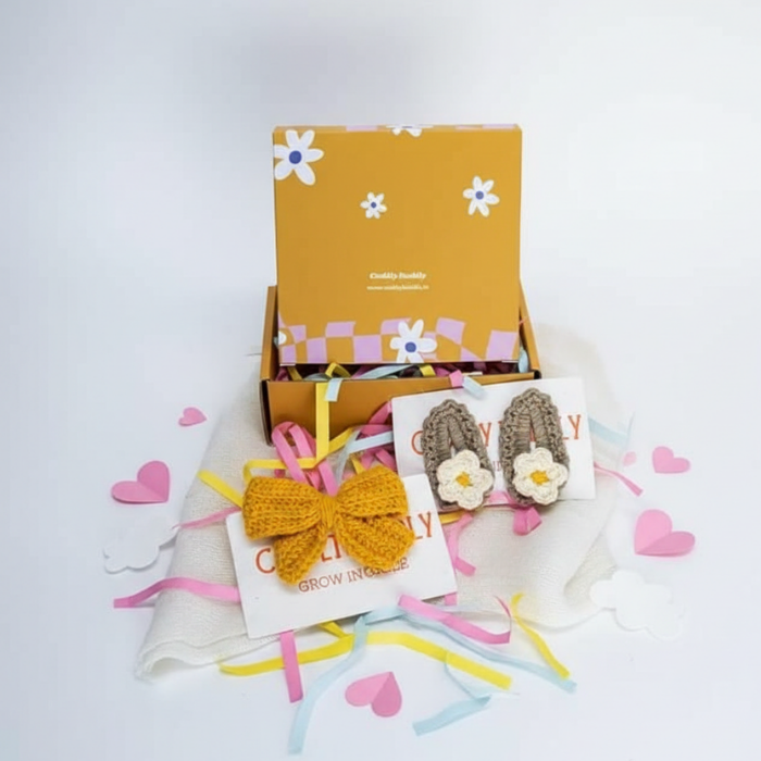Neutral daisy pair with a bright bow — a cheerful handmade accessory set for little girls.Premium handmade crochet hair accessory gift box