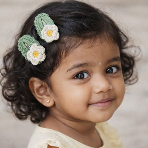 Handmade crochet hair accessory gift box with 1 daisy pair + 1 bow clip. Premium look, gentle on hair, perfect for gifting.